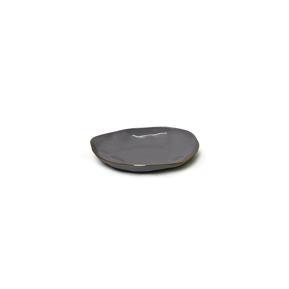 Irregular leaf shape plate with glossy glazed interior and matte rough exterior. Decorated with nostalgic golden rim. With its own handicraft nature, a slight variation is presented. Used for sauces, desserts, or as a saucer for your bowl and cup.
