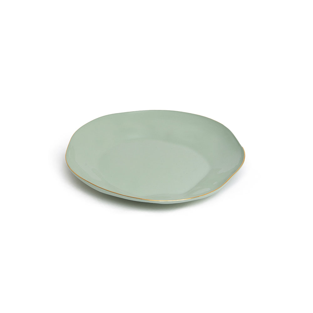 Round-shaped plate with glossy glazed interior and matte rough exterior. Decorated with nostalgic golden rim. With its handicraft nature, a slight variation is presented. Suitable for main course of both Oriental and Western meal.