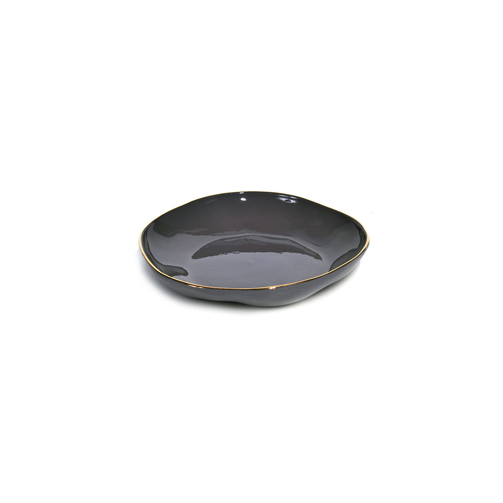 Round-shaped plate with glossy glazed interior and matte rough exterior. Decorated with nostalgic golden rim. With its handicraft nature, a slight variation is presented. Used for personal portion, desserts, or as a saucer for your bowl and cup.