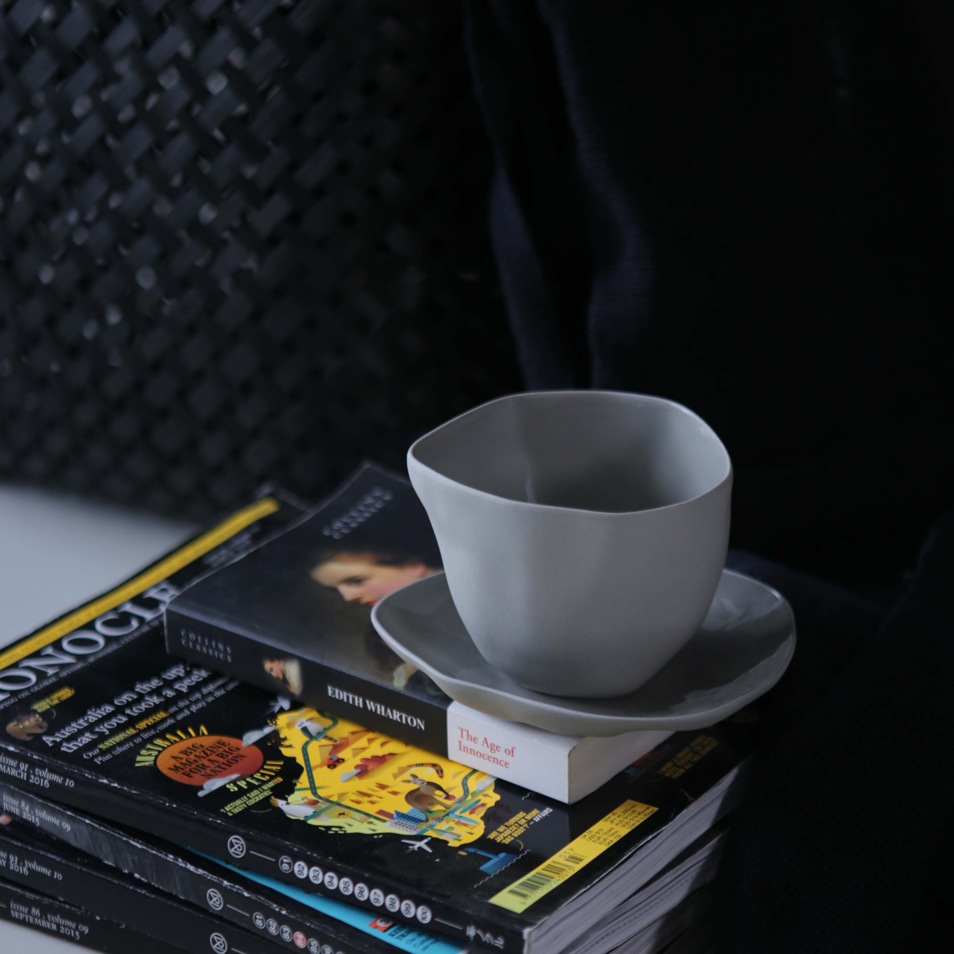 A cup with glossy finish inside, matte rough outside and simple colors, creating softness and harmony. Suitable for tea, macchiato and cold drinks.